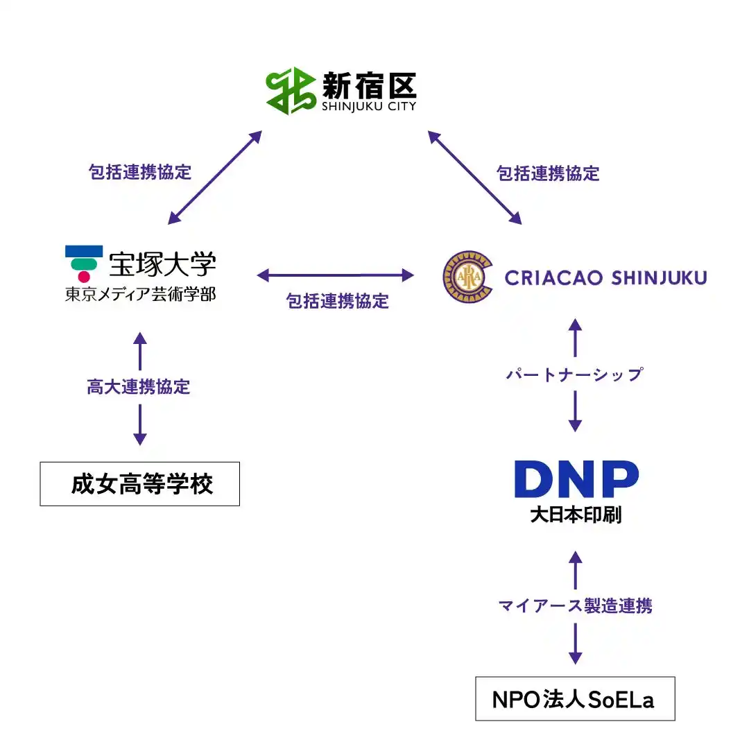 本プロジェクトは、クリアソン新宿が法人パートナー契約を締結しているDNPが、マイアースの製造に関わっていることを契機に始まりました。そこから、包括連携協定を結ぶ新宿区の地域振興部と協議し、新宿区および同クラブと包括連携協定を結ぶ宝塚大学東京メディア芸術学部、さらに同大が高大連携協定を結ぶ成女高校へと連携が広がり、行政、学校とサッカークラブと企業が一体となって、さらに広げる取り組みへと発展しました。クリアソン新宿はNPO法人SoELaと共同でプロジェクトを取りまとめ、支えていきます。 |