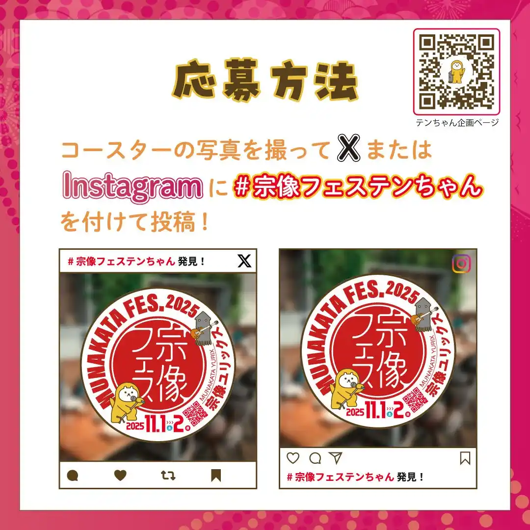 写真を撮ってXまたはinstagramに #宗像フェステンちゃん を付けて投稿していただいた方へ抽選で40名様を宗像フェスに招待いたします! |