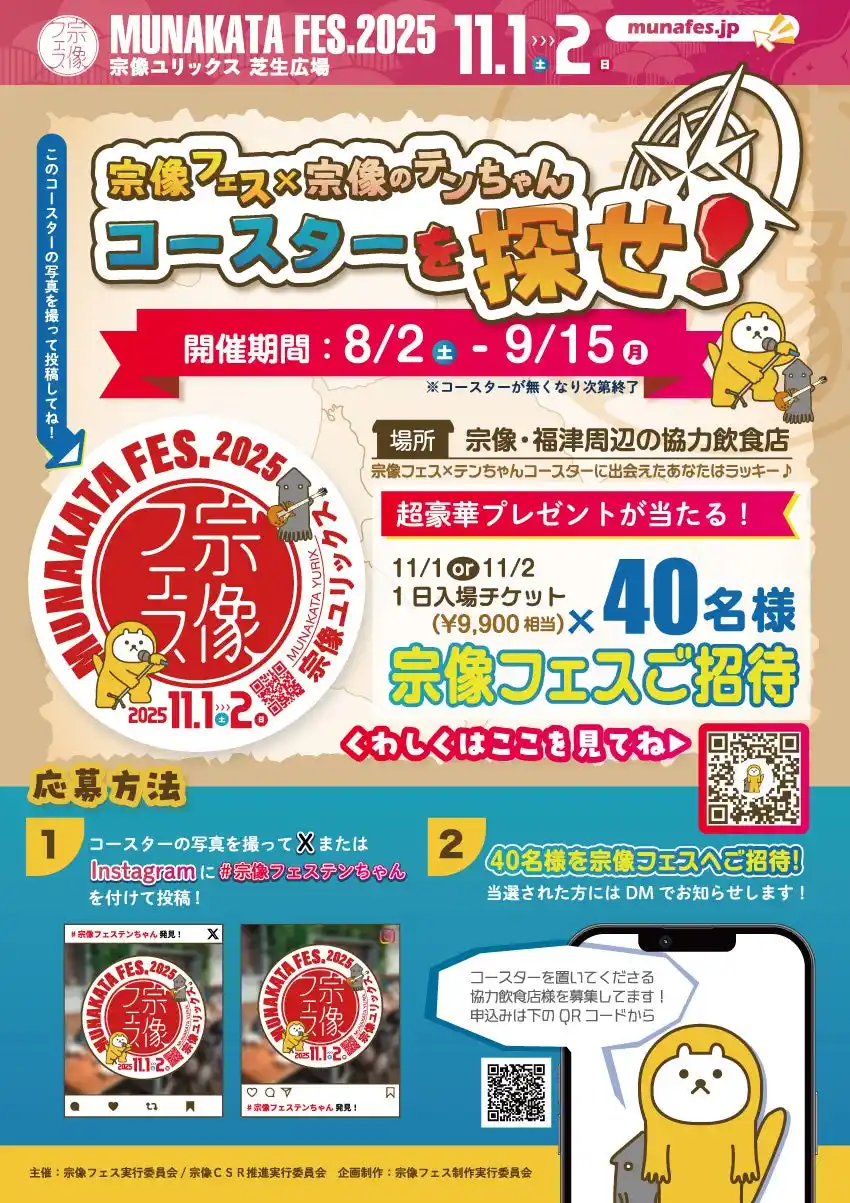 8月2日から宗像・福津周辺の協力飲食店様にて「宗像フェス ×宗像のテンちゃん」がデザインされたコースターを出していただいています。そのコースターに出会えたあなたはラッキー♪ |