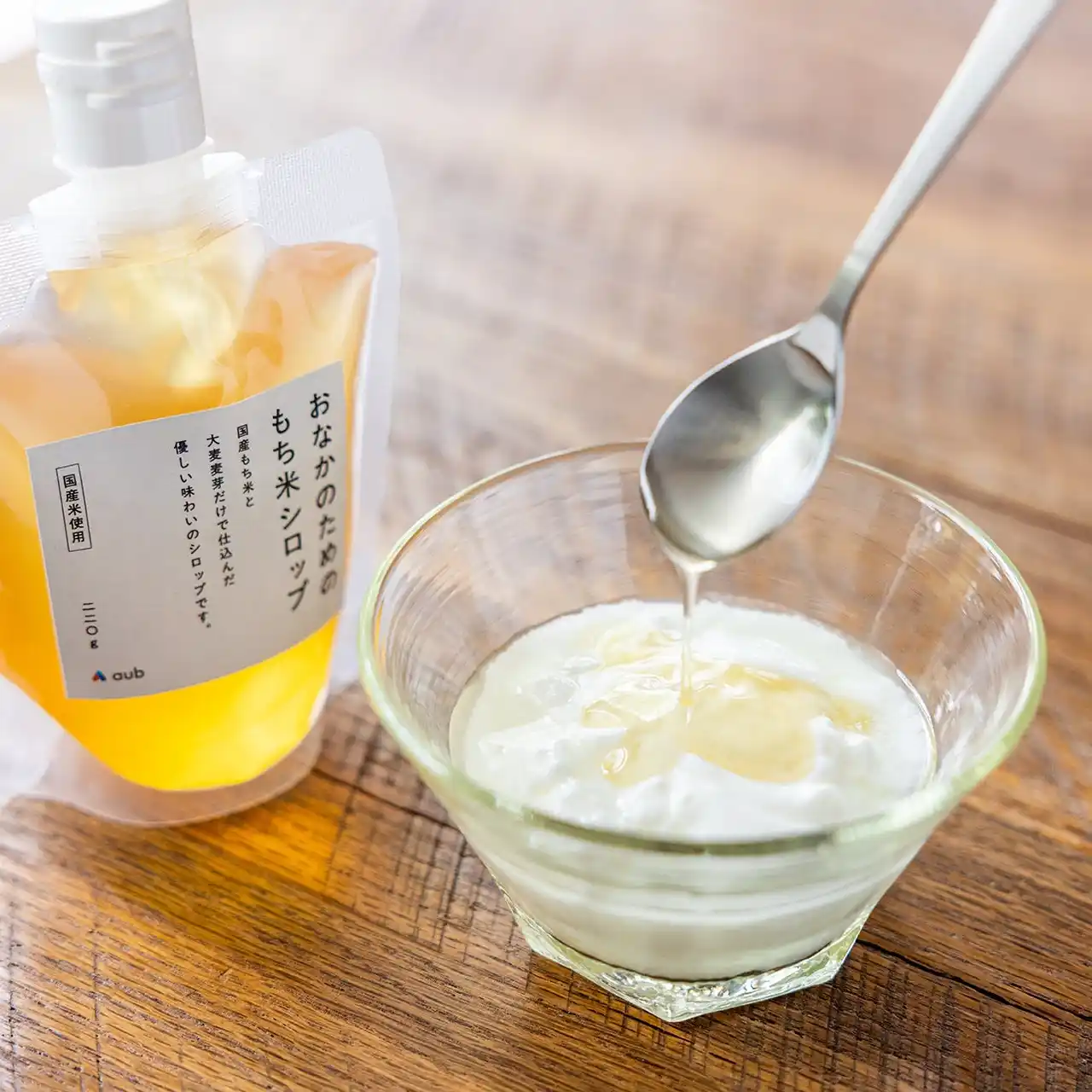 「おなかのためのもち米シロップ」(2個セットで税込1,990円/1個220グラム)は、国産の「もち米」と「大麦麦芽」だけでつくった、自然由来の「シロップ」です。“米シロップ”は、「もち米」に含まれる「でんぷん」を、麦芽の「酵素」によって「ブドウ糖」や「マルトース」に分解する工程(=糖化)を経てつくられます。一般的な白砂糖と比べて、腸内環境が乱れる原因となる果糖(フルクトース)が少ないため、腸に優しいのが特徴です。
