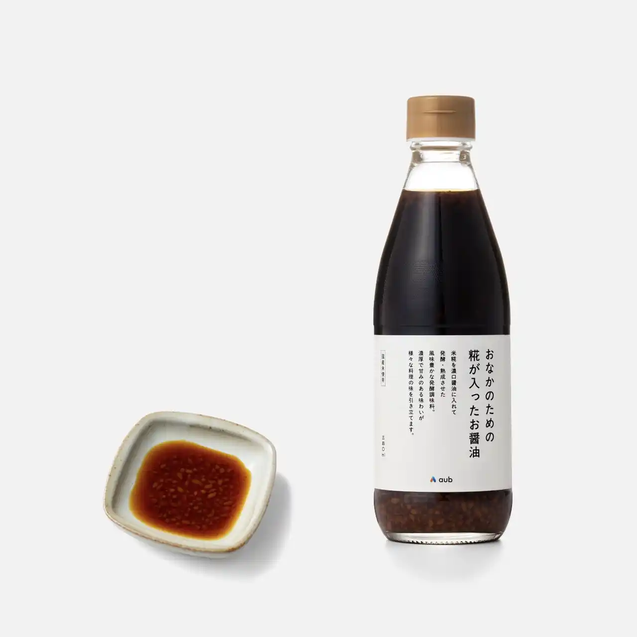「おなかのための糀(こうじ)が入ったお醤油」(2本セットで税込1,490円/1本340ミリリットル)は、通常1回の発酵過程を二度繰り返すことで、より濃厚なうまみと香りを引き出した「醤油」です。 |