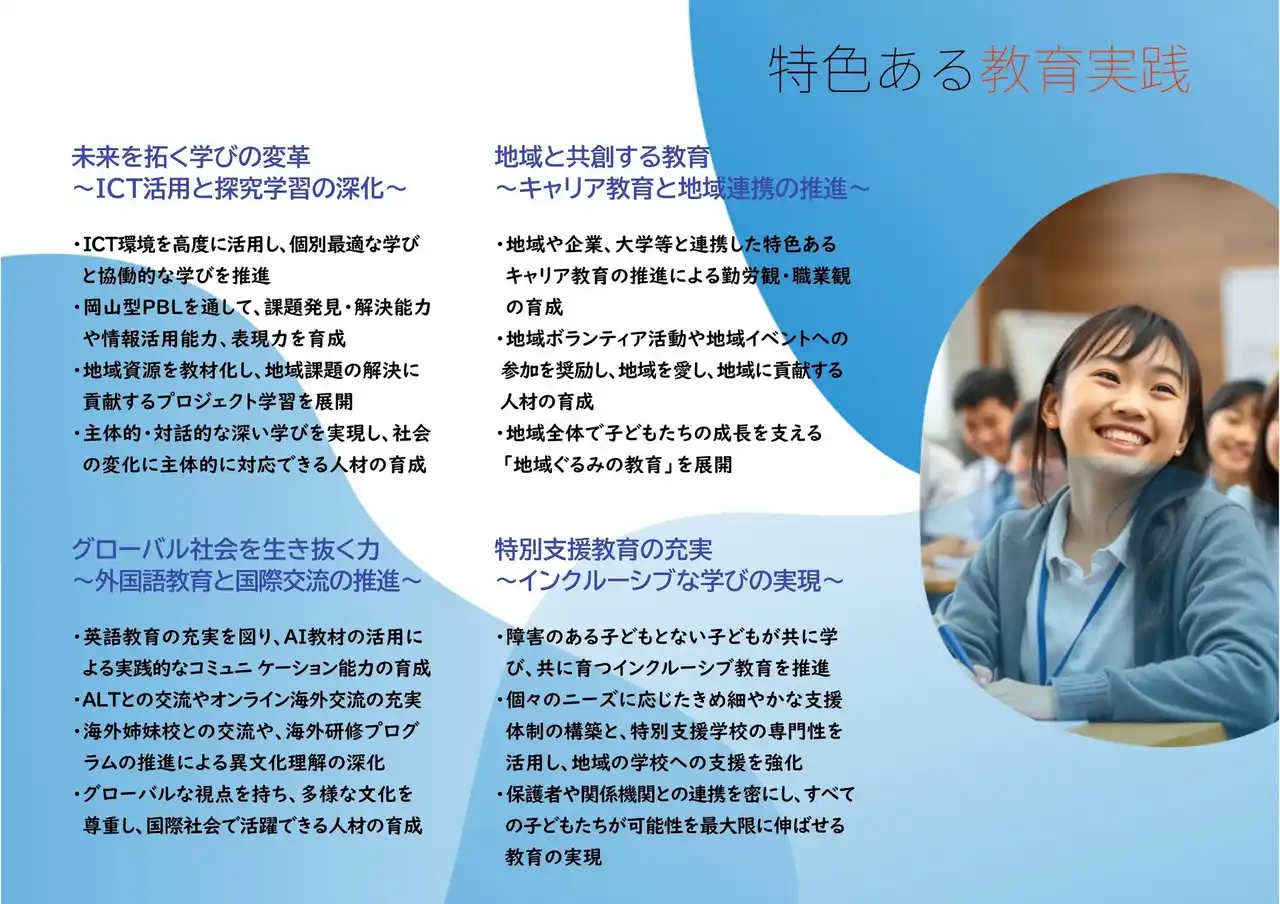 岡山県では、民間企業等で培ったリーダーシップを教育現場に活かし、子どもたちの未来と学校の新時代を切り拓く力を持つ方々を対象に、令和8年度公立学校長(任期付職員)の選考試験を実施します。学校経営に意欲的で、教育現場に新しい視点をもたらすリーダーを求めています。 |