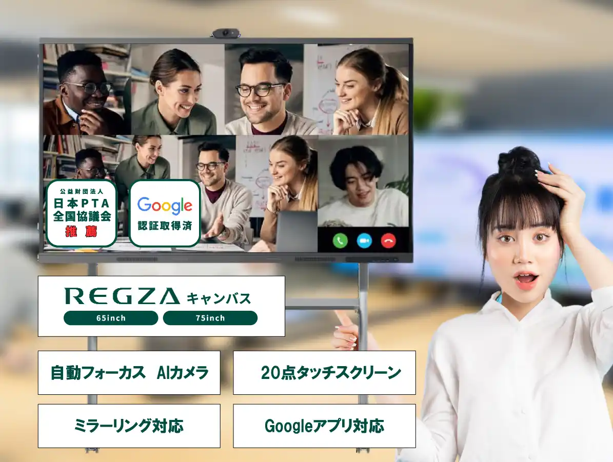 他にも専用ホワイトボードアプリや、REGZAキャンバス同士の画面共有(同じネットワーク環境)、時間管理に便利なタイマー機能、災害時にも安心のエコモード、そして耐久性に優れた安心設計など、ビジネスシーンで活躍する様々な機能を搭載しています。 |