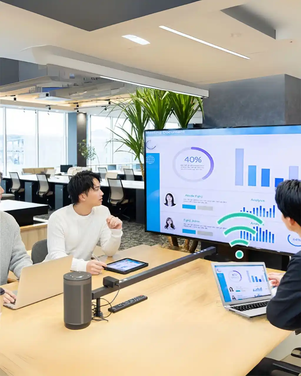 対面、WEB、ハイブリッド、どのスタイルでも電源を入れるだけでスマート会議が実現できます。 |