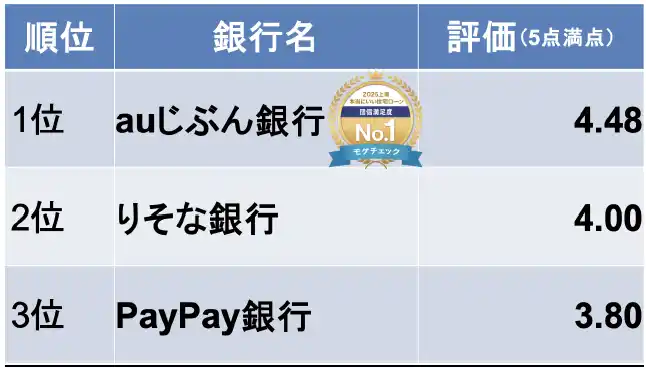 auじぶん銀行が1位に選ばれました。ペアローン連生団信やがん保障付き団信をはじめとする保障内容の充実や、他社よりも低い金利で追加保障が受けられる点が高く評価されています。2位には、独自の「団信革命」で多彩な保障を提供するりそな銀行がランクインしました。3位のPayPay銀行は、手厚い保障の超サポ団信やペアローン連生団信が人気の理由となっています。 |