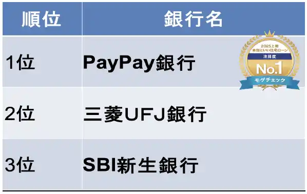 1位はPayPay銀行でした。昨年実施したモゲチェック特別金利や2024年12月から2025年2月まで実施された金利引き下げキャンペーンに加え、充実した無料付帯の団体信用生命保険(超サポ団信)が大きな注目を集めました。2位には三菱UFJ銀行がランクイン。常に業界トップクラスの低金利を維持しており、安定した人気を誇っています。3位はSBI新生銀行です。2025年1月から3月までの期間限定金利引き下げキャンペーンが注目を集め、モゲチェック特別金利を提供していたことから、多くの利用者から支持を得ました。なお、SBI新生銀行は2025年7月から9月の間でも金利引き下げキャンペーンを実施しており、2025年8月現在もお得な条件での利用が可能です。 |