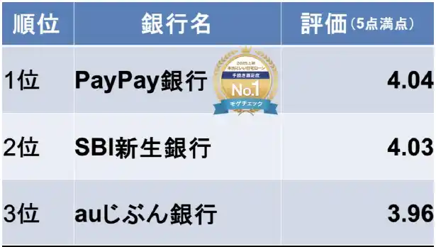 PayPay銀行が1位となりました。「審査が非常に早かった」といった声が多く寄せられ、高い評価につながっています。また、「他の銀行と同時に仮審査を申し込んだが、PayPay銀行は圧倒的に早く、手続きも簡単だった」という利用者のコメントもあり、スピード感と手軽さが支持を集めています。 |