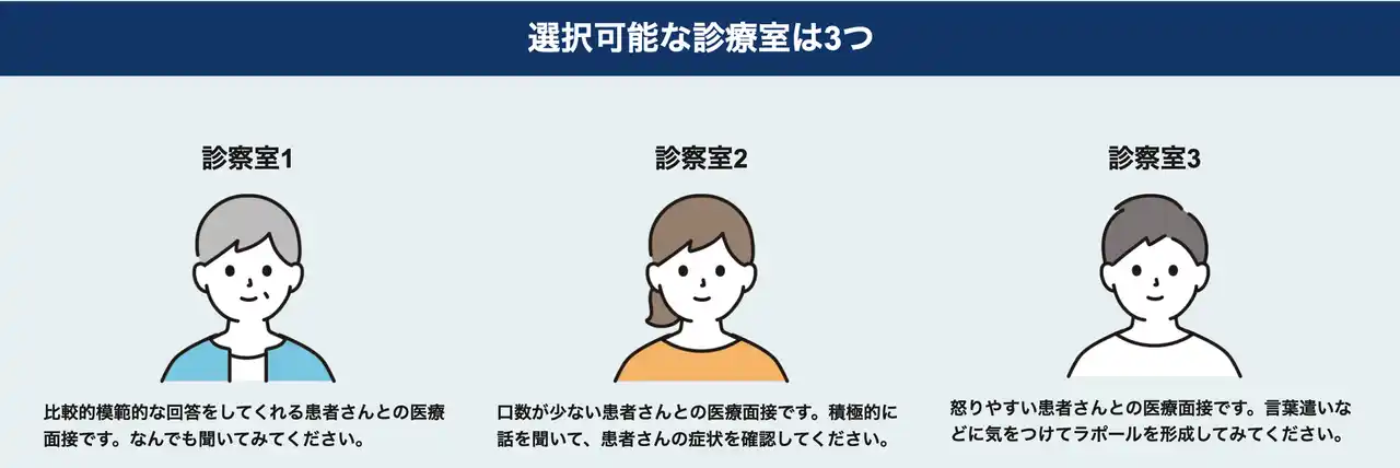 OPQRSTでは、1つの疾患に対して3タイプの「主訴(主な症状)」が用意されています。さらに、それぞれの主訴ごとに異なる性格の患者が「診察室1」「診察室2」「診察室3」に待機しており、1疾患あたり最大9パターンの問診シミュレーションが可能で、実践的なトレーニング環境を提供します。 |