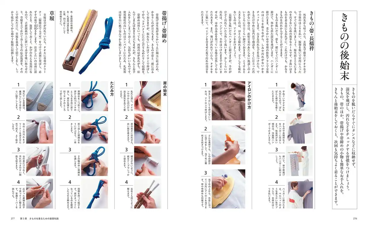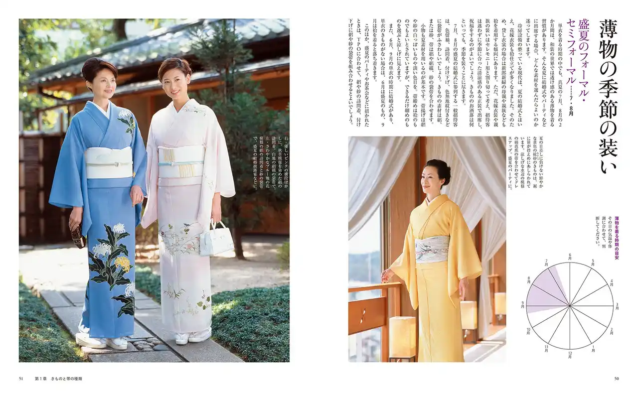 きものを着るときに必要な情報も網羅しています。着付けに必要なもの、事前の準備、浴衣・小紋・留袖・振袖・男のきものの着付け、着た後のたたみ方やお手入れなど、プロセス写真で説明しています。巻末にはフォーマル度や季節に合わせた着こなし早見表も。きものに関するすべての疑問に応える1冊です。 |