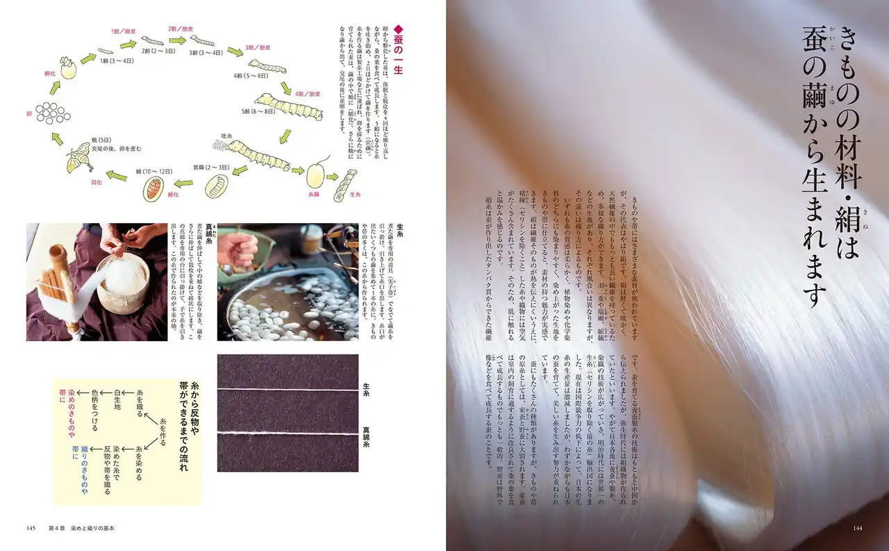 素材や模様、染め織りの技法など、きものには日本の手仕事文化が凝縮されています。絹糸の取り方に始まり、綿や自生植物などの自然素材がいかに生かされているか。産地や技法ごとに、美しい写真でたっぷりとお見せします。長い年月の中で洗練を重ねてきた、「日本の色と形」の魅力をお伝えします。 |