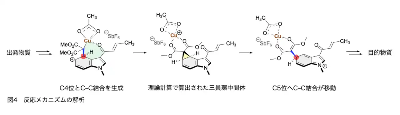 研究グループは、DFT計算(注4)を駆使して反応機構の解析を行うことで、興味深い機構で反応が進行している可能性を見出しました。理論計算によって導き出された仮説は、アルキル化反応がインドールC5位で直接起こるのではなく、C4位で炭素-炭素(C-C)結合を形成(図4左)した後、3つの原子が環状につながる、三員環構造を有する中間体(図4中央)を経て、C5位に結合が移動(図4右)するというものでした。この仮説の妥当性を検証すべく実験を行ったところ、理論計算により導かれた反応経路の裏付けとなる実験結果が得られました。 |
