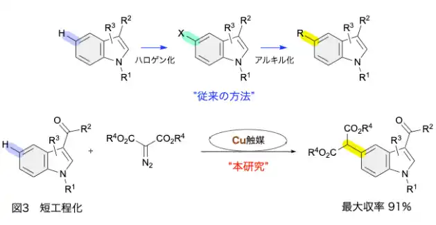 そこで本研究では、ジアゾ基(C=N2)を有する化合物と銅触媒を用いて銅カルベン種を発生させ、それをインドール誘導体と反応させることで、C5位に炭素鎖(黄色ハイライト部分)を導入する反応の開発に挑戦し、最大91%という優れた収率で目的物を得ることに成功しました(図3下部)。この反応は様々な構造をもったインドール誘導体に適用可能であるため、多様な医薬品候補分子を効率的に合成する道を拓きます。 |