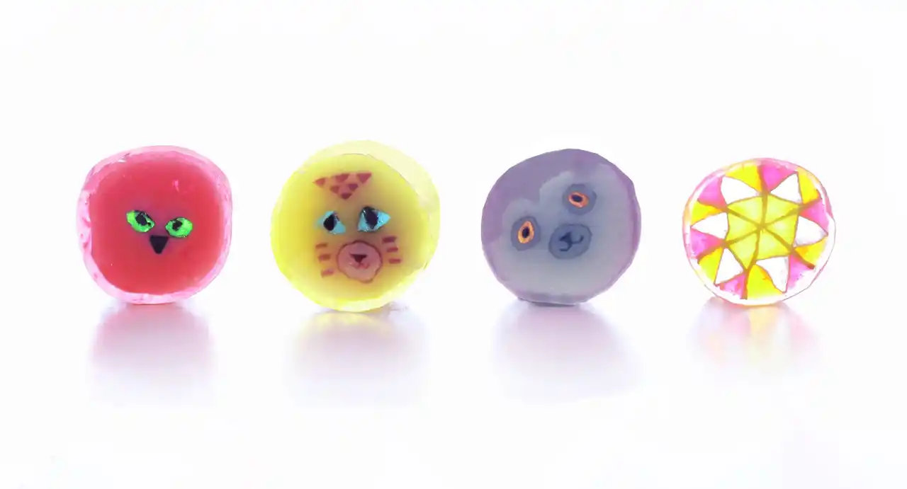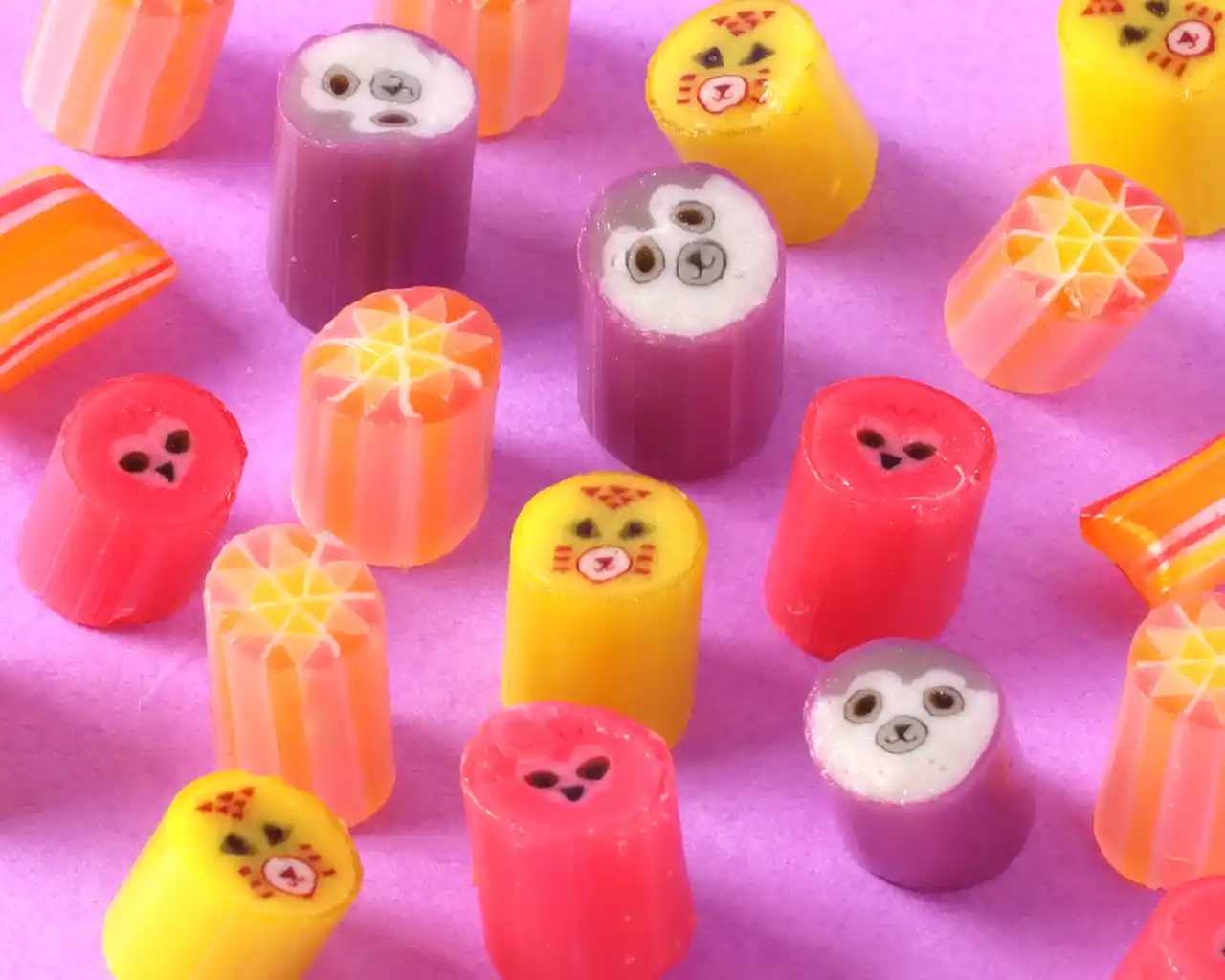 キャンディは、光に透かすと動物の目がキラリと光る、遊び心あふれる仕掛け付き。まるで暗闇で目を光らせる本物の夜行性動物のような、不思議でワクワクするキャンディです。 |