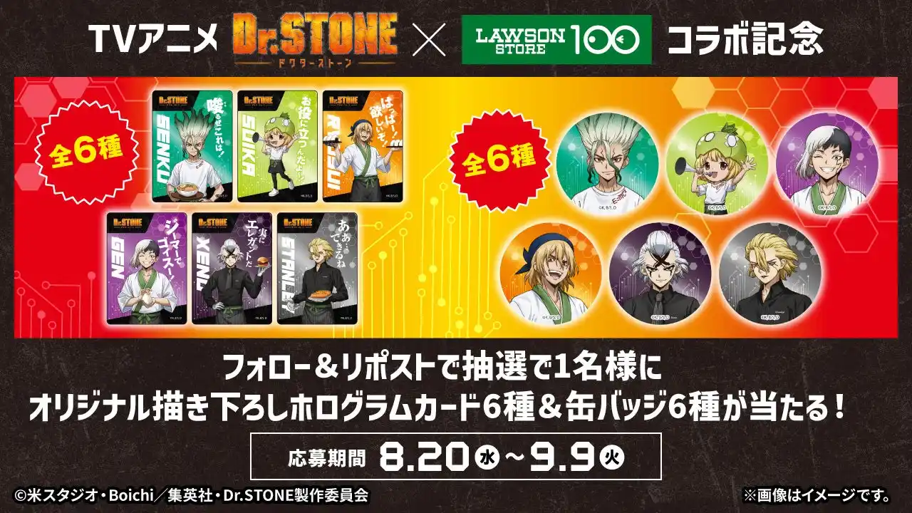 また公式Xでのフォロー&リポストキャンペーンでは、「描き下ろしオリジナル缶バッジ&カードコンプリートセット」が抽選で当たるキャンペーンも合わせて開催します。ぜひ、この夏TVアニメ『Dr.STONE』で盛り上がるローソンストア100で、様々な企画をお楽しみください。