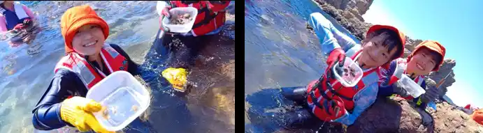隠岐めし歴史探検隊!2日目は島根県海士町の無人島「小森島」で、海の幸探し!隊員の子どもたちは、カサガイ、カメノテをたくさん見つけました!ほかにもイシダイやアゴハゼの稚魚、ウミウチワ、アオウミウシなども見つけました。さらにシースクーターを使って、海を探検しました。無人島は、人が住む地域の海よりも、昔の海の環境に近く、隠岐の伝統料理の歴史を学ぶのに適した場所でした。 |