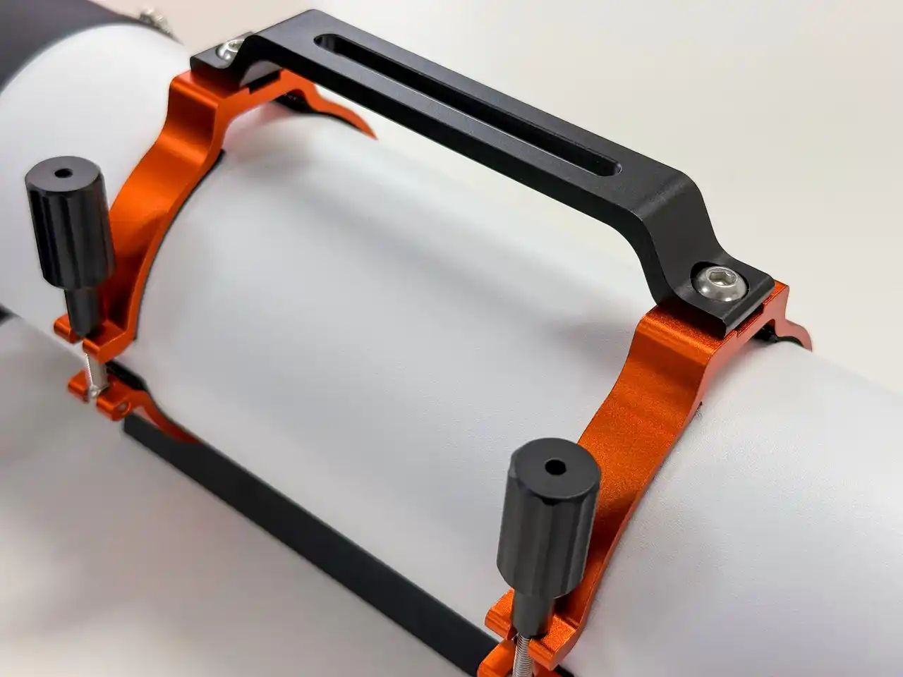 工具レスで着脱可能な鏡筒バンドには、マウント搭載時や運搬時に便利なハンドルが標準装備されています。 |