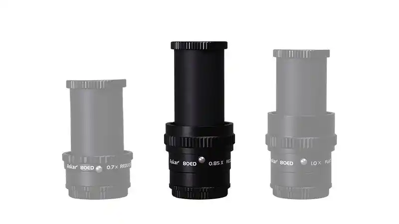 Askar 80ED専用に設計された、APS-C対応のフラットナーレンズです。焦点距離を0.85倍に短縮し、像面湾曲を補正することでイメージサークルの端までピントの合ったシャープな像を得ることが可能です。 |