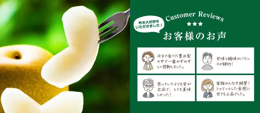 山崎梨園さんの豊水梨は、果皮に張りがあり、シャリシャリとした食感に加えて甘酸っぱい果汁をたっぷり含んでいるため別格です。お客様からは「今まで食べた豊水梨の中で一番みずみずしく感動しました。」「甘味と酸味のバランスが絶妙!」「思っていたよりも実が立派で、とても美味しかった!」と、昨年大好評をいただいております。一度食べたらやみつきになる美味しさを存分にご堪能ください。 |