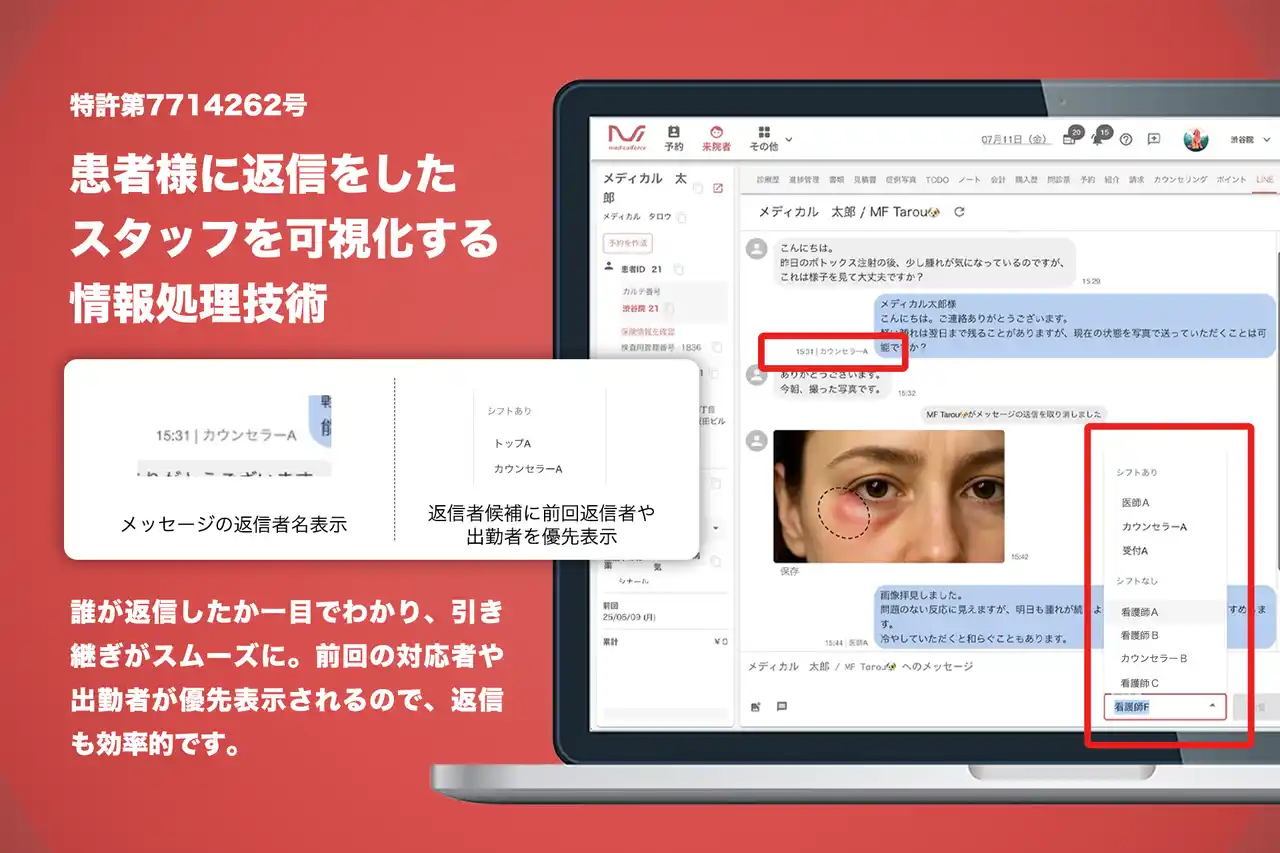 本技術は、LINE等のメッセージングアプリと電子カルテを連携させた際に、クリニックの公式アカウントを通じてやりとりされた各メッセージについて「どのスタッフが返信したのか」をカルテ画面上で簡単に識別できる仕組みです。 |