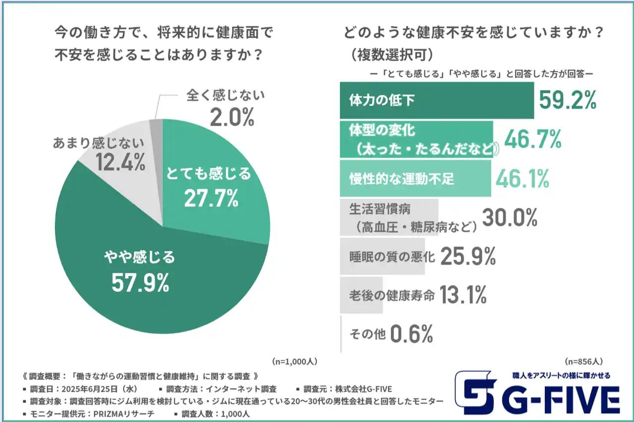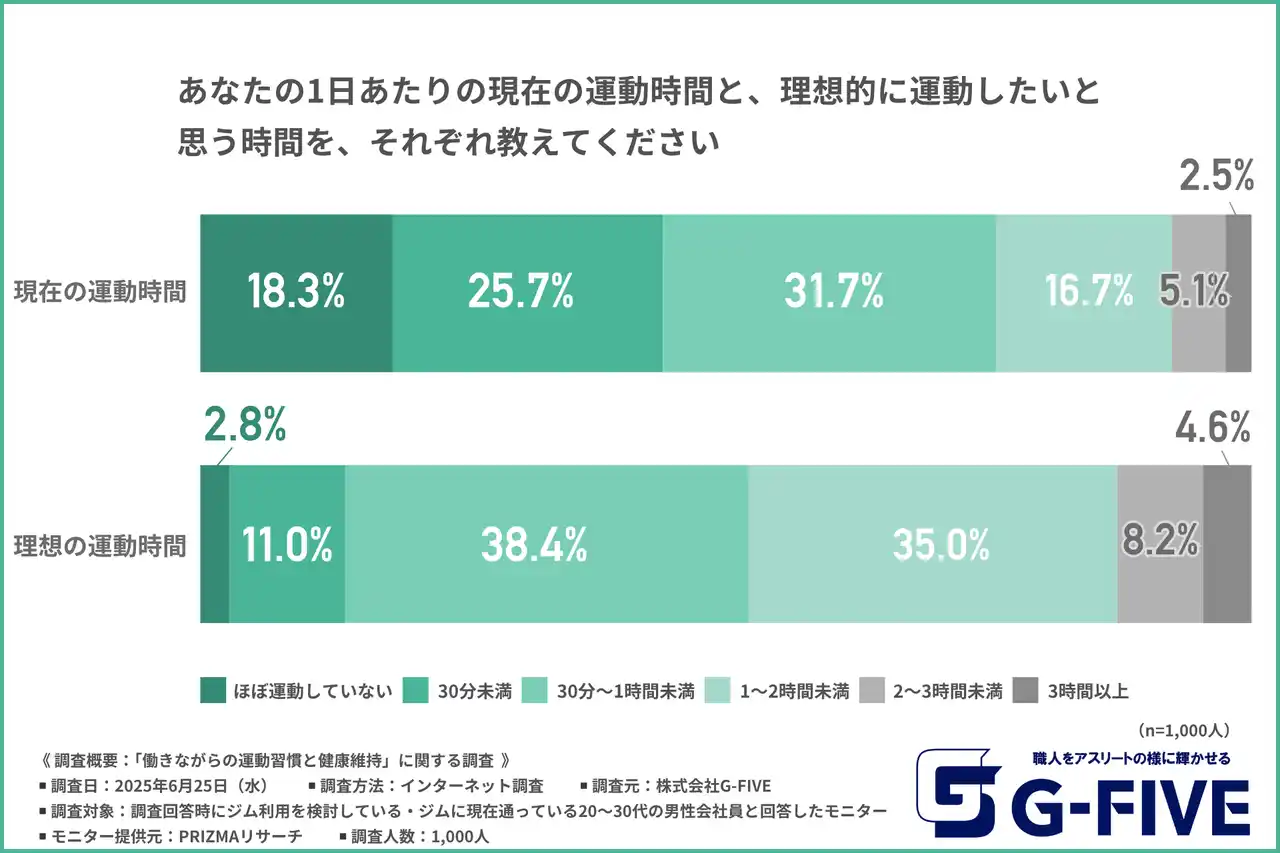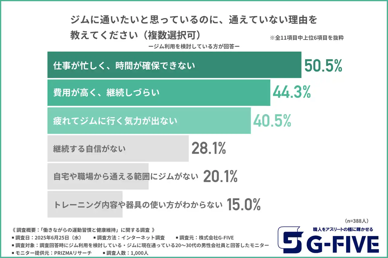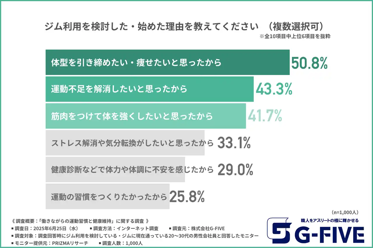 株式会社G-FIVE(所在地:静岡県富士市、代表取締役:岩邊 大樹)は、ジム利用を検討している・ジムに現在通っている20~30代の男性会社員を対象に、「働きながらの運動習慣と健康維持」に関する調査を実施しました。