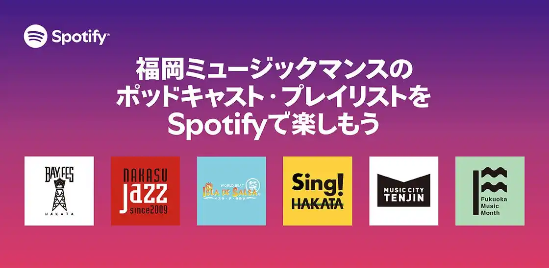 | 11年目の今年は、1億曲以上の音楽や650万番組以上のポッドキャストが楽しめる、世界で最も人気のあるオーディオストリーミングサービスSpotifyとタッグを組み、9月の音楽の祭典を盛り上げていきます。より一層パワーアップした「Fukuoka Music Month 2025」が今年もいよいよ始動します! | |||||||||||||||