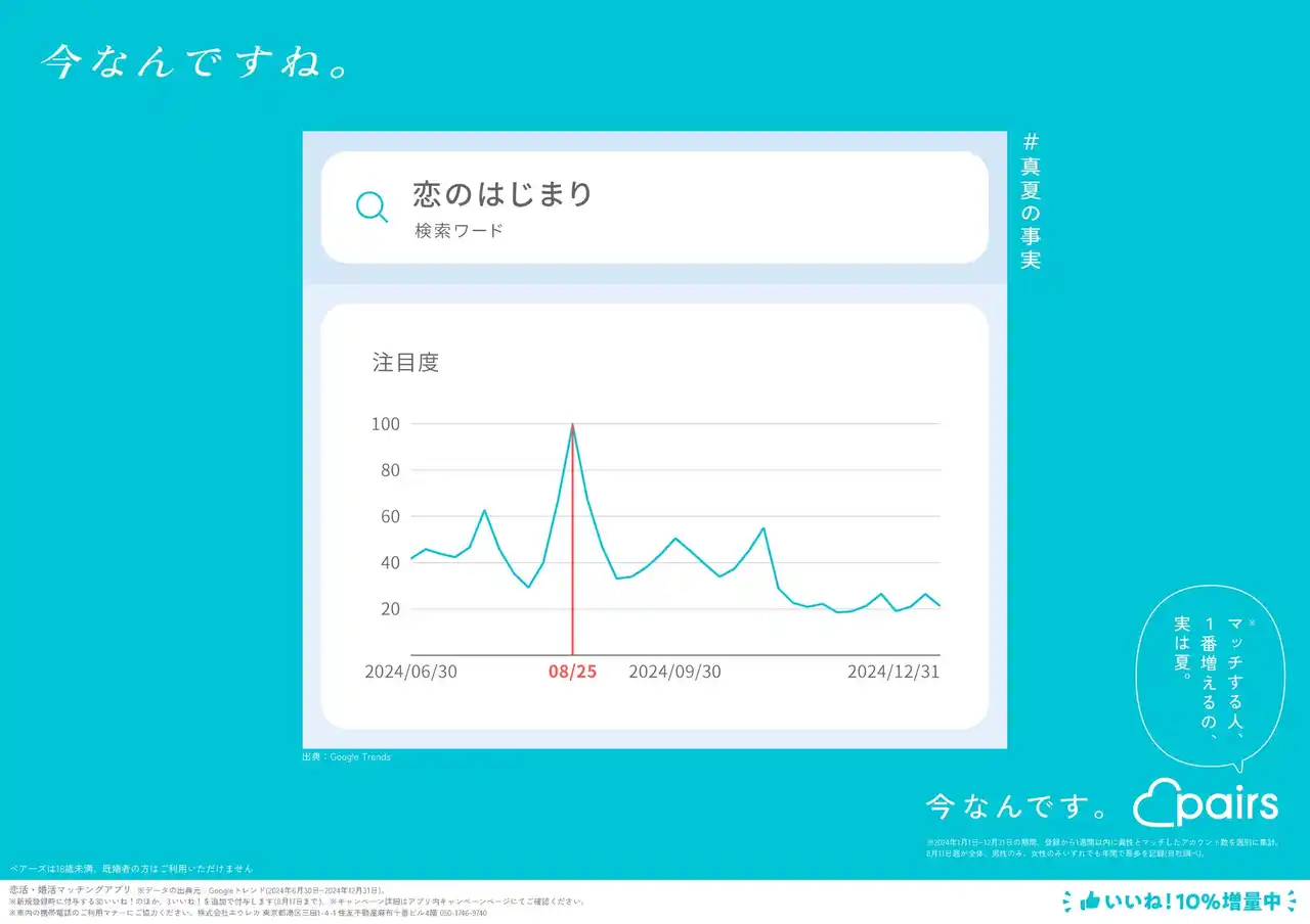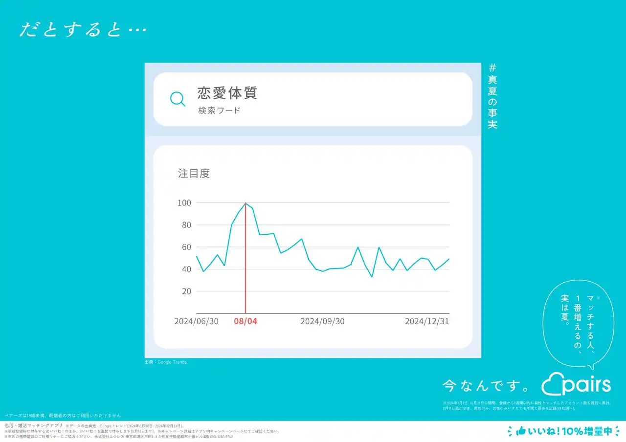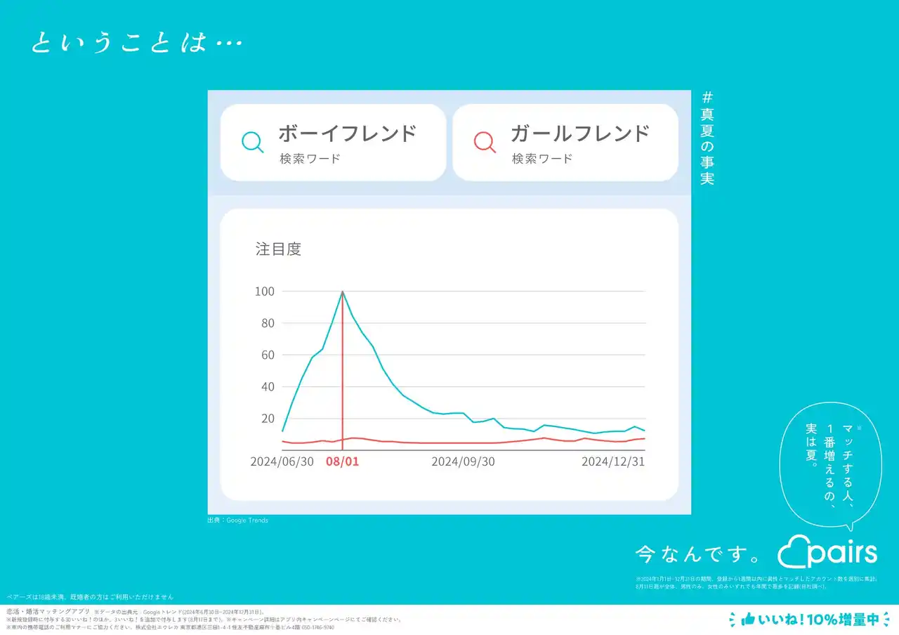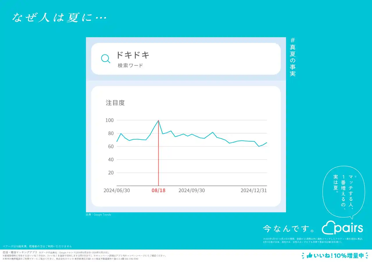 恋活・婚活マッチングアプリ「Pairs(ペアーズ)」を運営する株式会社エウレカ(本社:東京都港区、代表取締役CEO:山本竜馬、以下 ペアーズ)は、Web検索のトレンドデータ※1に基づいた恋愛にまつわる“意外な事実”を取りまとめた「#真夏の事実」キャンペーンを開始します。同キャンペーンでは、2025年8月4日(月)から東京メトロ銀座線、丸ノ内線、日比谷線 ドア横ポスターや、JR東日本 首都圏各線中づり等で広告掲載を順次開始します。またXでは「夏恋大喜利キャンペーン」を同日から14日間に渡り開催し、優秀回答者等140名様にAmazonギフトカードを最大1万円分進呈します。その他、ペアーズのアプリ内で新規登録時に付与される「いいね!」の数を期間限定で10%増量します。 |