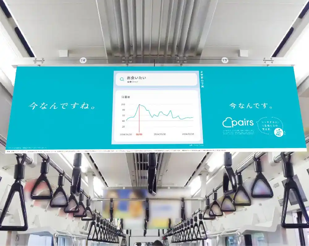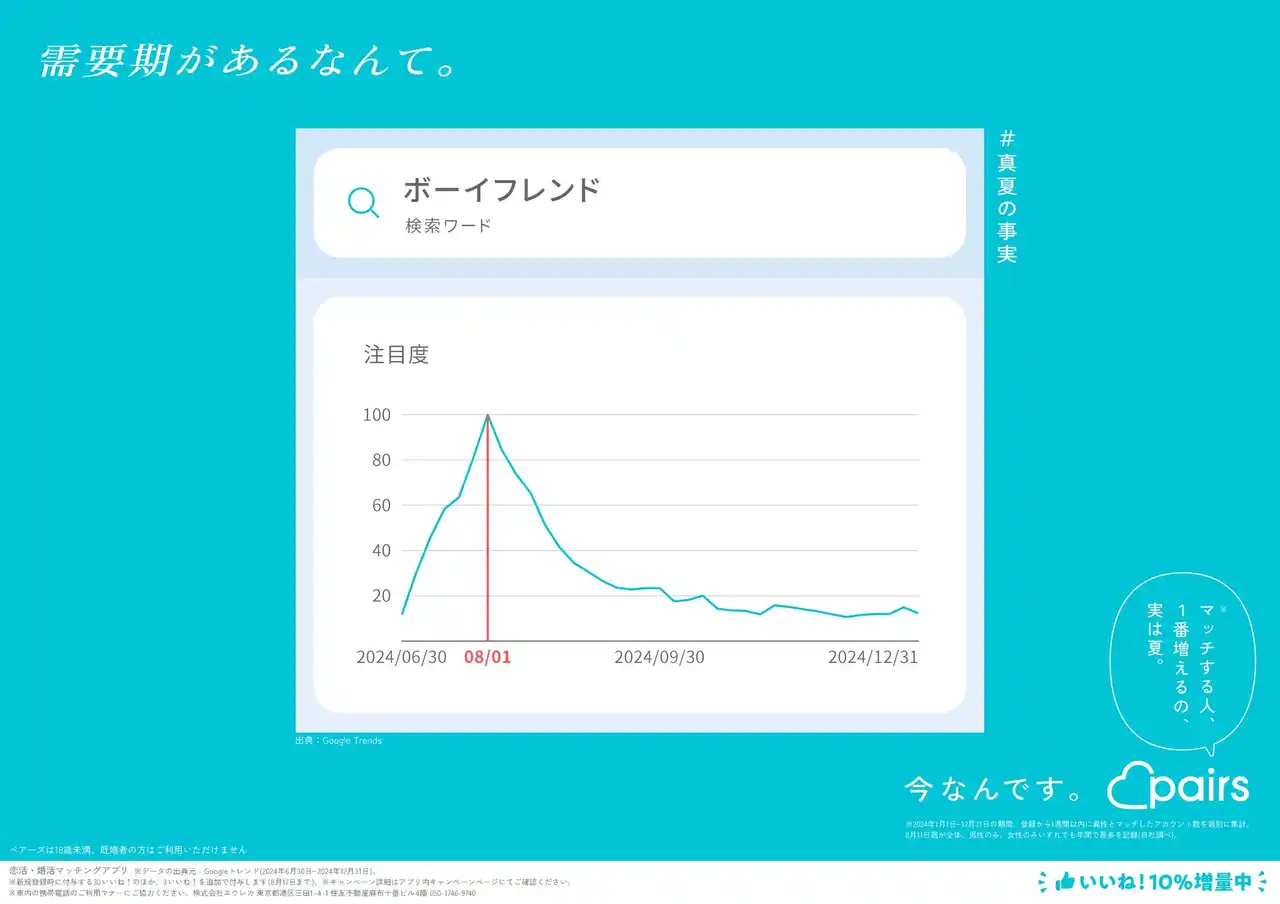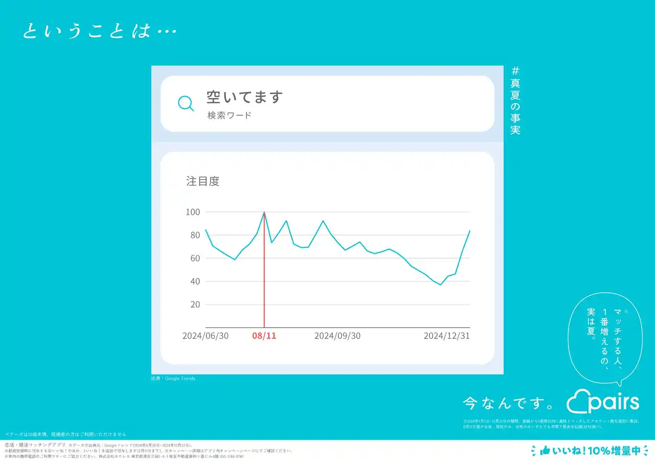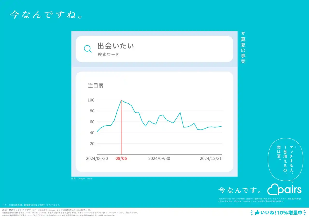 恋活・婚活マッチングアプリ「Pairs(ペアーズ)」を運営する株式会社エウレカ(本社:東京都港区、代表取締役CEO:山本竜馬、以下 ペアーズ)は、Web検索のトレンドデータ※1に基づいた恋愛にまつわる“意外な事実”を取りまとめた「#真夏の事実」キャンペーンを開始します。同キャンペーンでは、2025年8月4日(月)から東京メトロ銀座線、丸ノ内線、日比谷線 ドア横ポスターや、JR東日本 首都圏各線中づり等で広告掲載を順次開始します。またXでは「夏恋大喜利キャンペーン」を同日から14日間に渡り開催し、優秀回答者等140名様にAmazonギフトカードを最大1万円分進呈します。その他、ペアーズのアプリ内で新規登録時に付与される「いいね!」の数を期間限定で10%増量します。 |