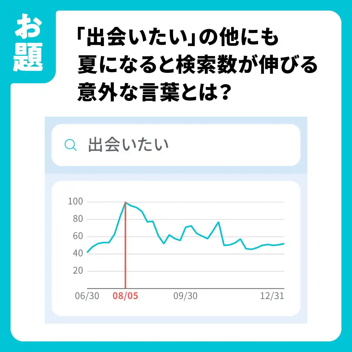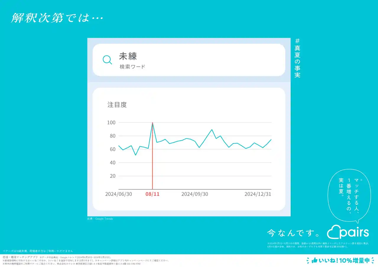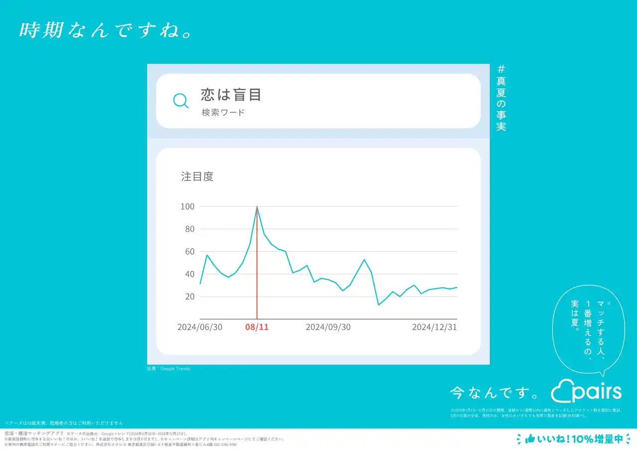 ペアーズはこの夏、恋愛にまつわるさまざまなキーワードをWeb検索のトレンドデータを独自に調査・収集し、#真夏の事実として恋愛にまつわる“意外な事実”をまとめました※2。事実の一つ、検索ワード「王子」は2024年1月1日から12月31日の1年間のうち、8月11日に最も検索されたという#真夏の事実が存在します。また、恋愛の王道キーワード「出会いたい」は8月5日、少しセンチメンタルな「恋は盲目」は8月11日、運命を感じる「ドキドキ」は8月18日等、全9件の“恋愛にまつわるキーワード”が、夏本番の8月に検索されていることを明らかにしました。ペアーズはこれらの#真夏の事実を元に、恋活・婚活に最適な季節が真夏の「今」であることを広告掲載やXキャンペーンで発信します。 |