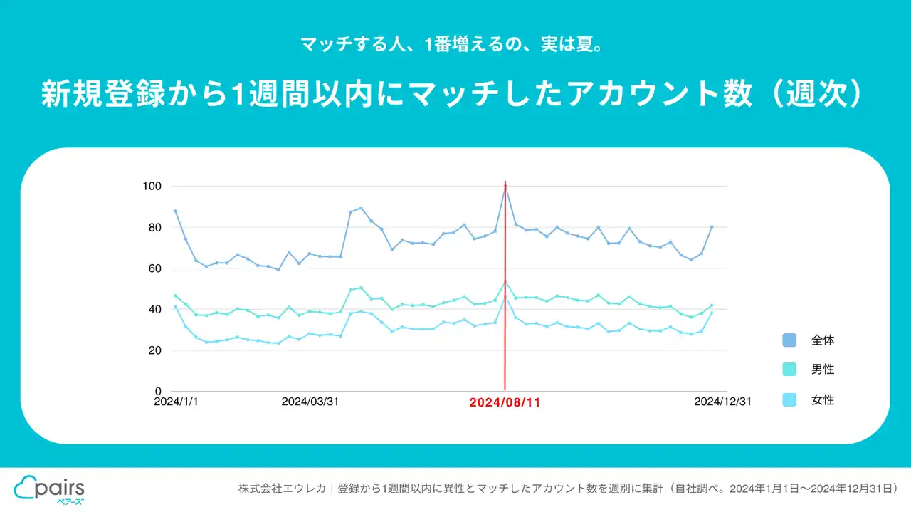 またWeb検索のトレンドワードだけでなく、同キャンペーンにおける「マッチする人、1番増えるの、実は夏。」というキーワードは、ペアーズのマッチングデータに基づく#真夏の事実の一つです。このデータは、2024年1月1日~12月31日の期間、登録から1週間以内に異性とマッチしたアカウント数を週別に集計。お盆にあたる8月11日週が男女合計、男性のみ、女性のみいずれにおいても年間で最多を記録しています(自社調べ)。さらに同じデータで、年間の週別平均マッチアカウント数に対する2024年8月11日週の倍率を見ると、男女の合計は1.39倍、女性は1.29倍、男性においては実に1.53倍と、マッチアカウント数が大きく伸びたことが明らかになりました※5。 |