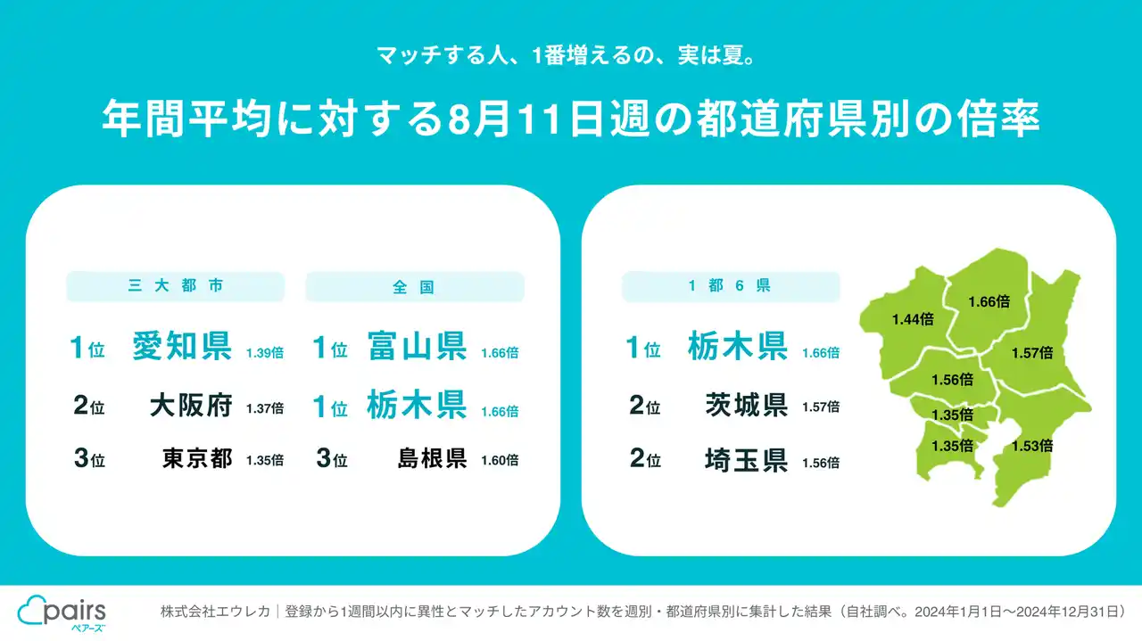 また首都圏にフォーカスすると前述の栃木県の他、茨城県が1.57倍、埼玉県が1.56倍、千葉県が1.53倍、群馬県が1.44倍と高い倍率を記録し、1.35倍の東京都と神奈川県を引き離す結果となっています。お盆の休暇期間にお相手を探す余暇時間が増加している人や、帰省時に居住地の設定を変更している人等の影響と考えられ、今年の夏も新たな出会いの機会が生まれることをペアーズも願っています。 |