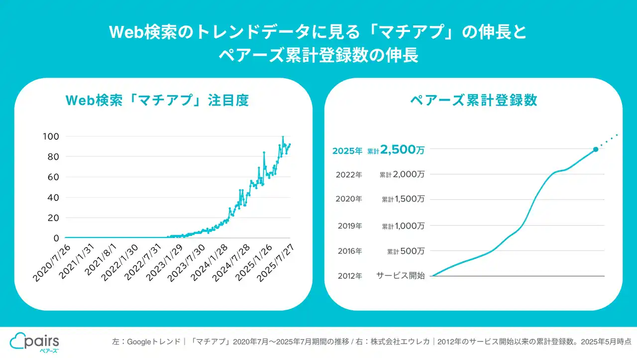 Web検索トレンドデータではもう一つ、恋愛にまつわる面白い実態が浮かび上がりました。いわゆる「アフターコロナ」が始まった2022年後半から、マッチングアプリの略語である「マチアプ」が2025年の現在に至るまで右肩上がりの増加を続けています※3。ペアーズは2012年のサービス開始以来、日本の恋活・婚活マッチングアプリとして独身男女の出会いの機会創出に貢献しており、2019年には累計登録数1000万を突破。“マチアプ”が検索され始めた2022年からの3年間でも、500万増の累計登録数2500万を突破しています※4。より簡潔にその存在を伝える略語の“マチアプ”が浸透しつつあるこの実情は、マッチングアプリのさらなる一般化を示しており、ペアーズは今後も、数多くのかけがえのない出会いを創出してまいります。 |