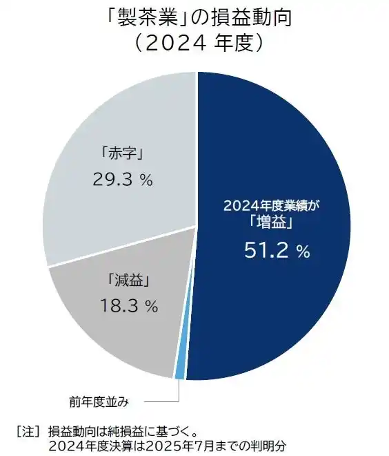 2024年度における製茶業の損益動向をみると、前年度から「増益」となった企業は51.2%と半数を超え、過去20年で最高だった一方、「減益」(18.3%)や「赤字」(29.3%)の「業績悪化」の割合も4割超を占めるなど、収益力の二極化が進んだ。自社で茶葉収穫から生産加工まで可能な製茶業者では、抹茶のほか、抹茶の原料となる碾茶(てんちゃ)生産へシフトしたことで大幅な売り上げ増となり、利幅を確保した企業が多かった。