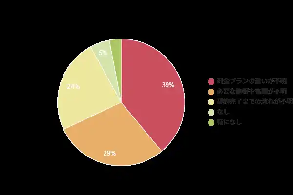 電気の開通手続き時に不安を感じた人へ、どんな部分に不安を感じたかアンケートを行ったところ、「料金プランの違い」が最も多く39%でした。次いで、「必要な情報や書類」「契約完了までの流れ」に不安を覚えた人も一定数いることがあきらかになりました。 |