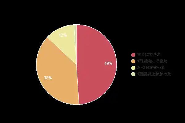 申し込みにかかった時間については、「すぐにできた」が49%、「1日以内にできた」が38%と、全体の87%が1日以内に完了したと回答しました。この結果から、申し込みの手続きは全体的にスムーズに進んでいる傾向が見られます。 |