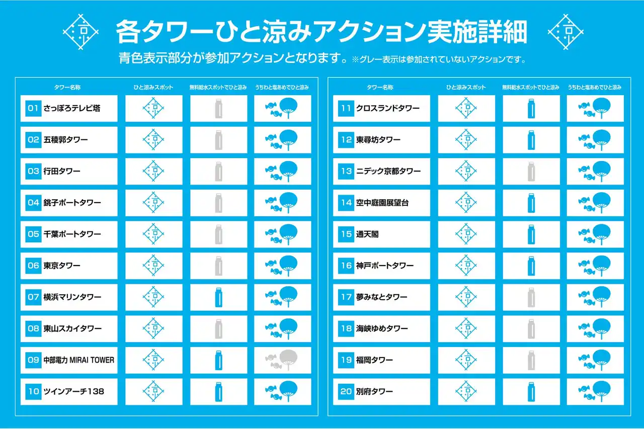 官民一体となった熱中症予防の啓発を推進している、熱中症予防声かけプロジェクト事務局(所在地:東京都渋谷区、一般社団法人ジャパンデザイン内、事務局長/社会起業家:山下太郎:以下本プロジェクト)は、日本全国のタワーが集まり情報交換やイベント活動等を行う「全日本タワー連盟」(会長:前田 伸/ 加盟数:20)と連携し、全日本タワー連盟に加盟し各観光地の名所でありランドマークである20のタワーと連携して観光シーンにおける熱中症予防の“ひと涼みサポートアクション”を2025年7月18日から展開しています。 |