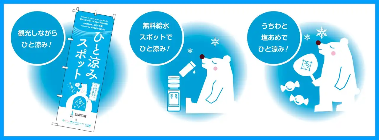 背景として、地球沸騰化に伴い暑さが増す日本において、クーリングシェルターや涼み処等の運用などが始まっていますが、まだまだインバウンドを含む観光客に向けた熱中症予防の啓発や対策は進んでいないように思われます。そこで、本プロジェクトと全日本タワー連盟が連携し、インバウンドを含む観光客に向けた、熱中症対策を推進する「ひと涼みサポートアクション」を推進しております。 |