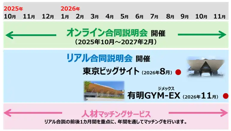 リアル合説は、来年2026年8月と11月の年2回開催。会期前後1ヵ月は、主催者事務局から求職者への架電等により、集中的なマッチングを実施。また、「会社説明をするだけ」の通常の合同説明会とは一線を画し、事前に採用情報を見て関心を持っている求職者に対し、出展社との会期当日の面談をセッティングする。 |