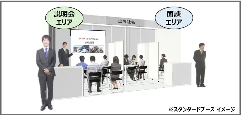 さらに、スタンダードブース(5.4m×2.7m)/プレミアムブース(5.4m×5.4m)では、同ブース内に説明会エリアと面談エリアを併設。当日の説明会参加者に対し出展社が、その場で面談を設定することも可能。会期中、会社説明と面談を同時に行うことで、求職者との質の高いマッチングを実現する。 |