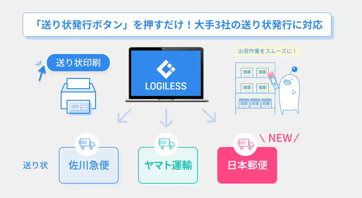 これまで「LOGILESS Plus[WMS]」では、佐川急便、ヤマト運輸の送り状発行にAPI連携で対応し、倉庫オペレーションの効率化を支援してまいりました。 |