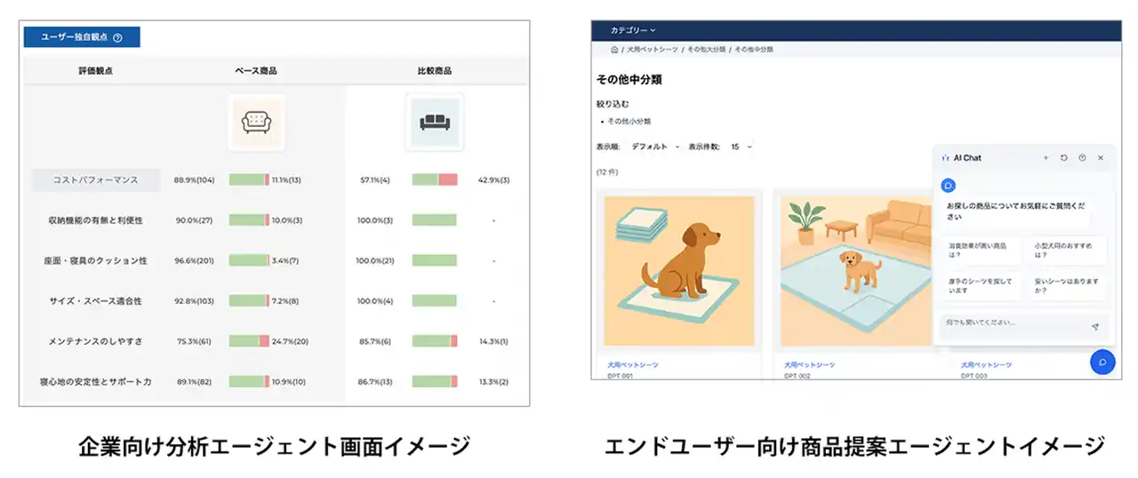 商品レビュー分析サービス「TrendViewer」を展開するHALDATA株式会社(本社:兵庫県神戸市、代表取締役:HAL hatanaka、以下:HALDATA)とデジタルビジネス総合支援を手掛ける株式会社DGビジネステクノロジー(デジタルガレージグループ会社 /本社:東京都渋谷区、代表取締役 兼 社長執行役員:清水 和徳、以下:DGBT)は、EC事業者向けのレビュー活用高度化とパーソナライズ接客の最適化を目的として、「企業向け分析エージェント」および「エンドユーザー向け商品提案エージェント」の2機能を統合した「EC向けエージェント β版」の共同開発に着手しました。 |