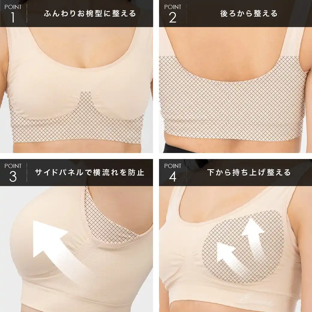 幅広のサイドパネルが横流れを防ぎ、下からふんわり持ち上げる立体設計。 |