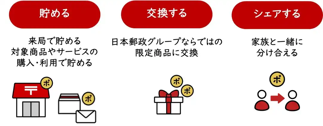 | 郵便局への来局時にポイントを「貯める」ことができ、貯まったポイントは、郵便局ならではの限定商品などと「交換ができる」ほか、ポイントを家族に「シェアする」ことが可能です。 | |||||||