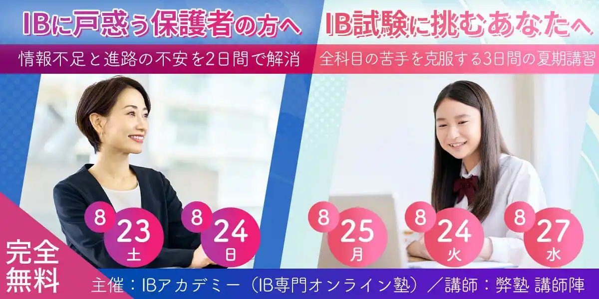 主催:IBアカデミー IBを知り尽くした講師と共に、この夏、最も効率的な学習と進路対策を。 |
