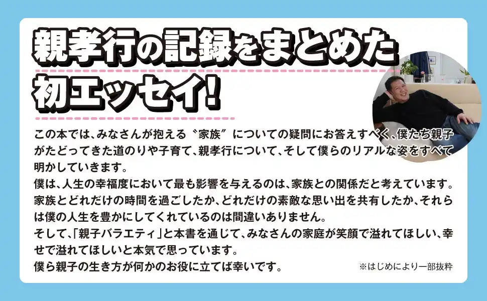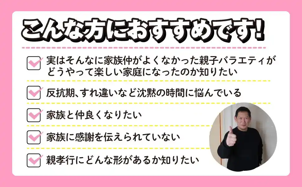 実はそんなに家族仲がよくなかった親子バラエティのリアルなエピソードを通じて、家族や親孝行について見つめ直すきっかけになれば幸いです。 |