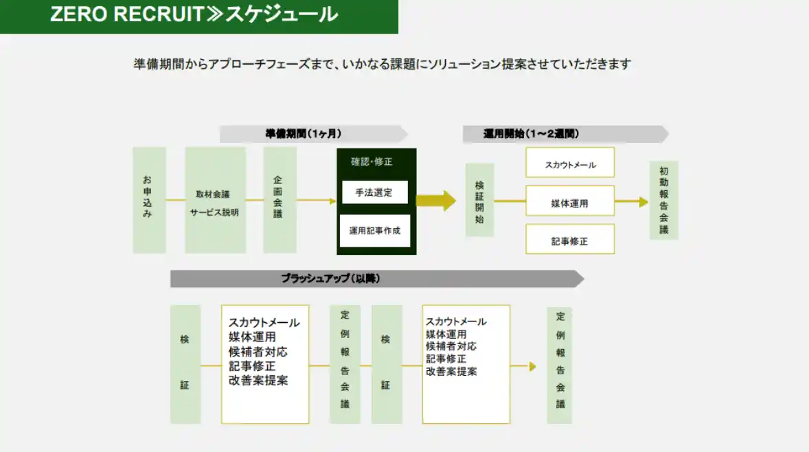 運用開始(1~2週間):検証開始・スカウトメール・媒体運用・記事修正 |