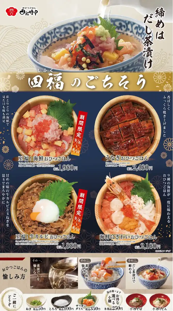株式会社イオンイーハート(所在地:千葉県千葉市、代表取締役社長:奥野善徳) が運営する日本最大のだし茶漬け専門チェーン『おひつごはん四六時中』では、「この夏、ちょっと贅沢に」をテーマに限定商品2品を含む「四福(しふく)のごちそう」メニューを8月6日(水)から販売いたします。