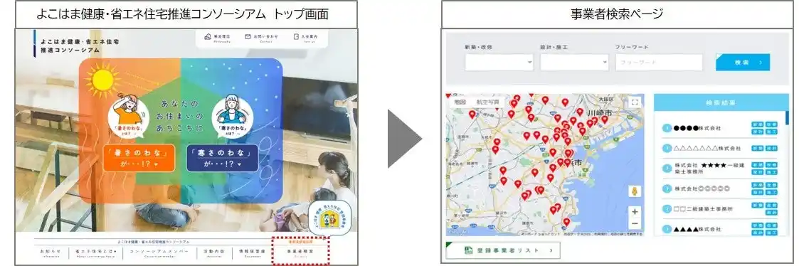 よこはま健康・省エネ住宅推進コンソーシアムのwebページにて、登録事業者をマップ上で表示します。 |