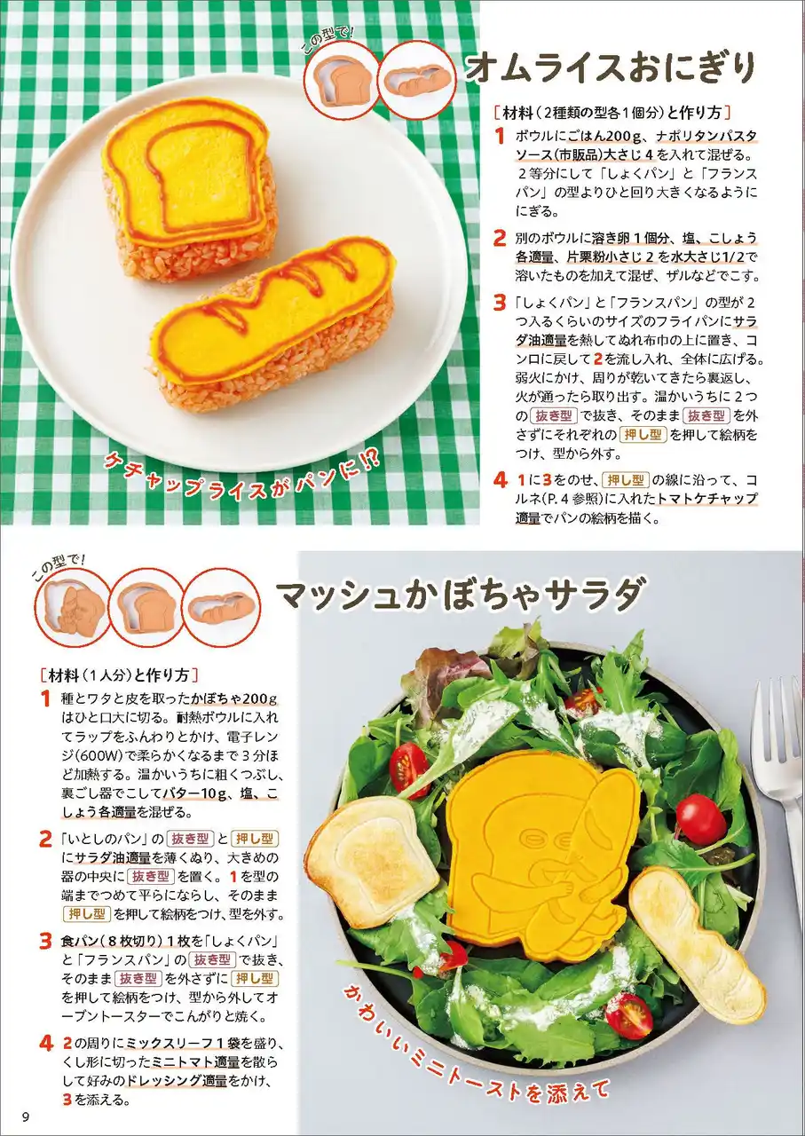 「パンどろぼう」×2種、「しょくパン」、「フランスパン」の全4種類の抜き型&押し型セットを使って、かわいいパンどろぼうのクッキーやどら焼き、ケーキなどのおやつから、カレー、ちらしずし、オムライスまでいろいろなレシピにトライできます。 |
