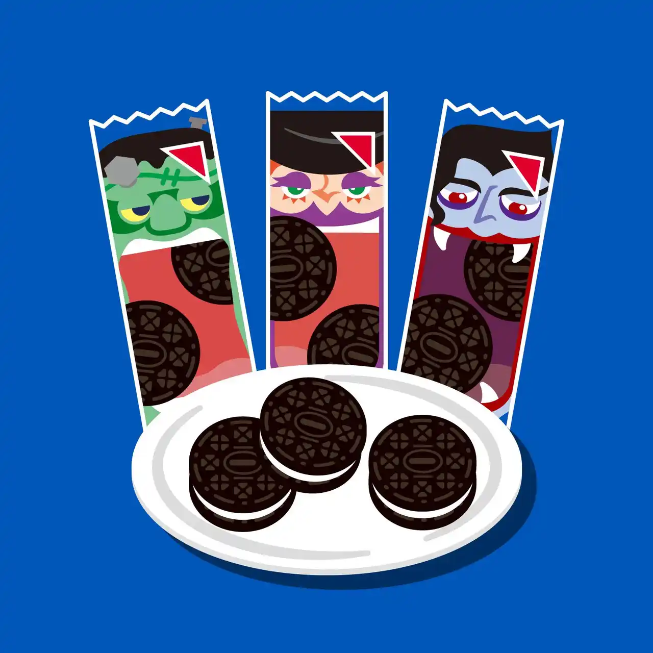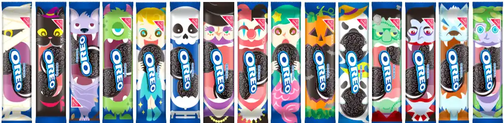 個包装パッケージには、オレオらしいポップな世界観と、ハロウィンにおいて定番のモンスター |