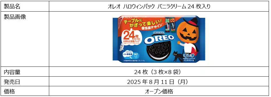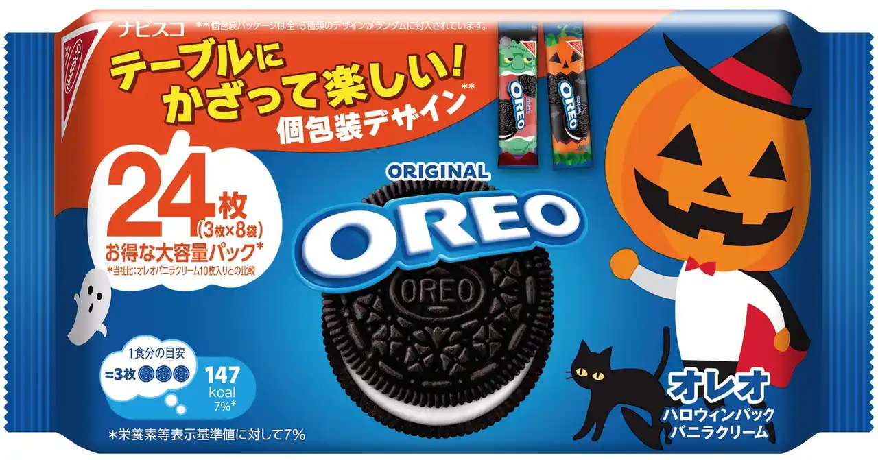 モンデリーズ・ジャパン株式会社(本社:東京都品川区/代表取締役社長:碇祐輔)のビスケットブランド「オレオ」は、ハロウィン限定パッケージの「オレオ ハロウィンパック バニラクリーム24枚入り」を、2025年8月11日(月)から全国のスーパーマーケット、コンビニエンスストアなどで、期間限定で発売します。 |